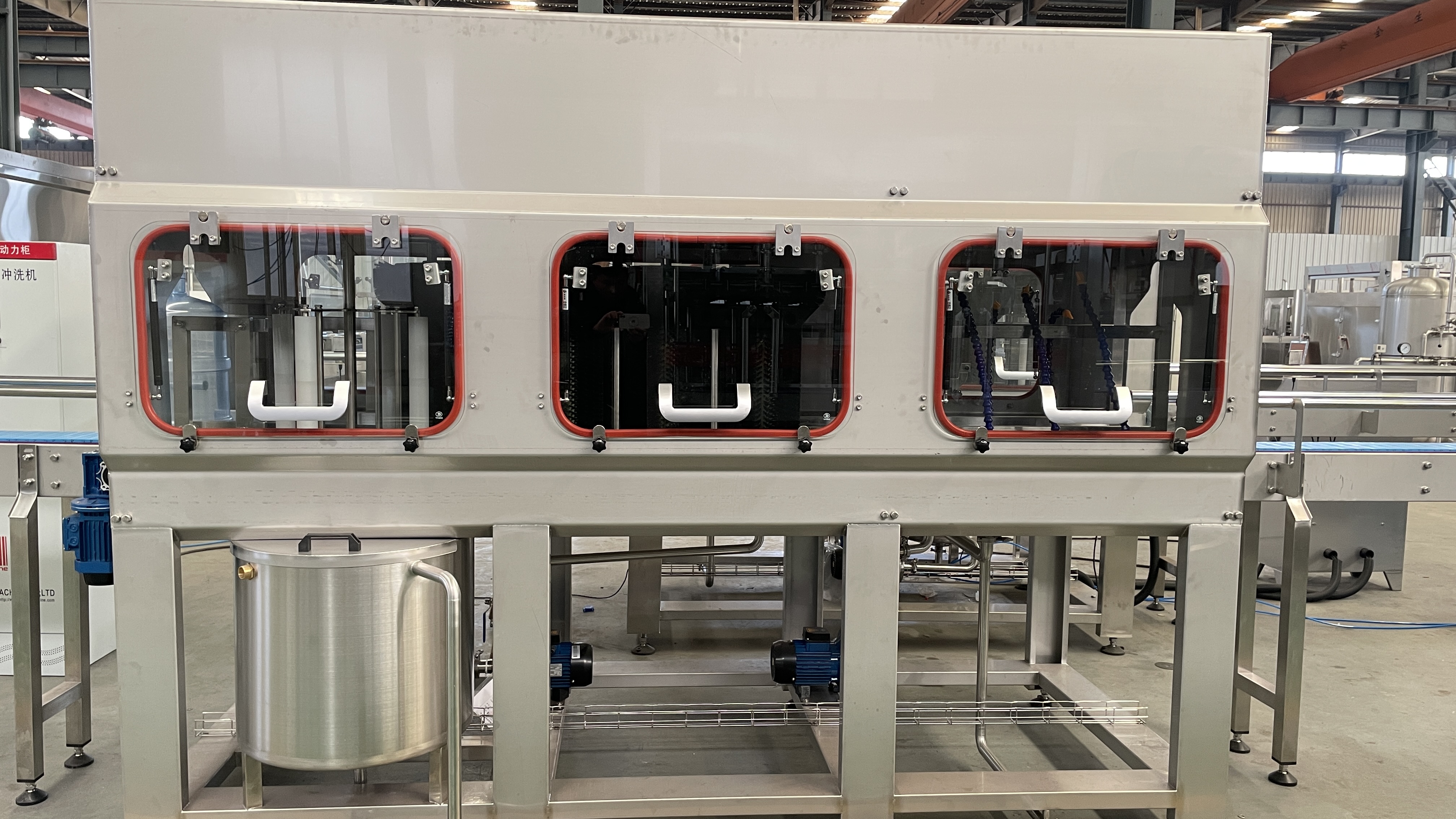 該設(shè)備集自動拔蓋、自動外刷桶、自動上瓶機構(gòu)、自動洗瓶消毒、自動灌裝、自動套蓋、自動壓蓋和燈檢、熱縮膜、提桶套袋、成品送出為一體,使用的原材料符合食品行業(yè)和其他行業(yè)要求。該設(shè)備采用AC380V電源.